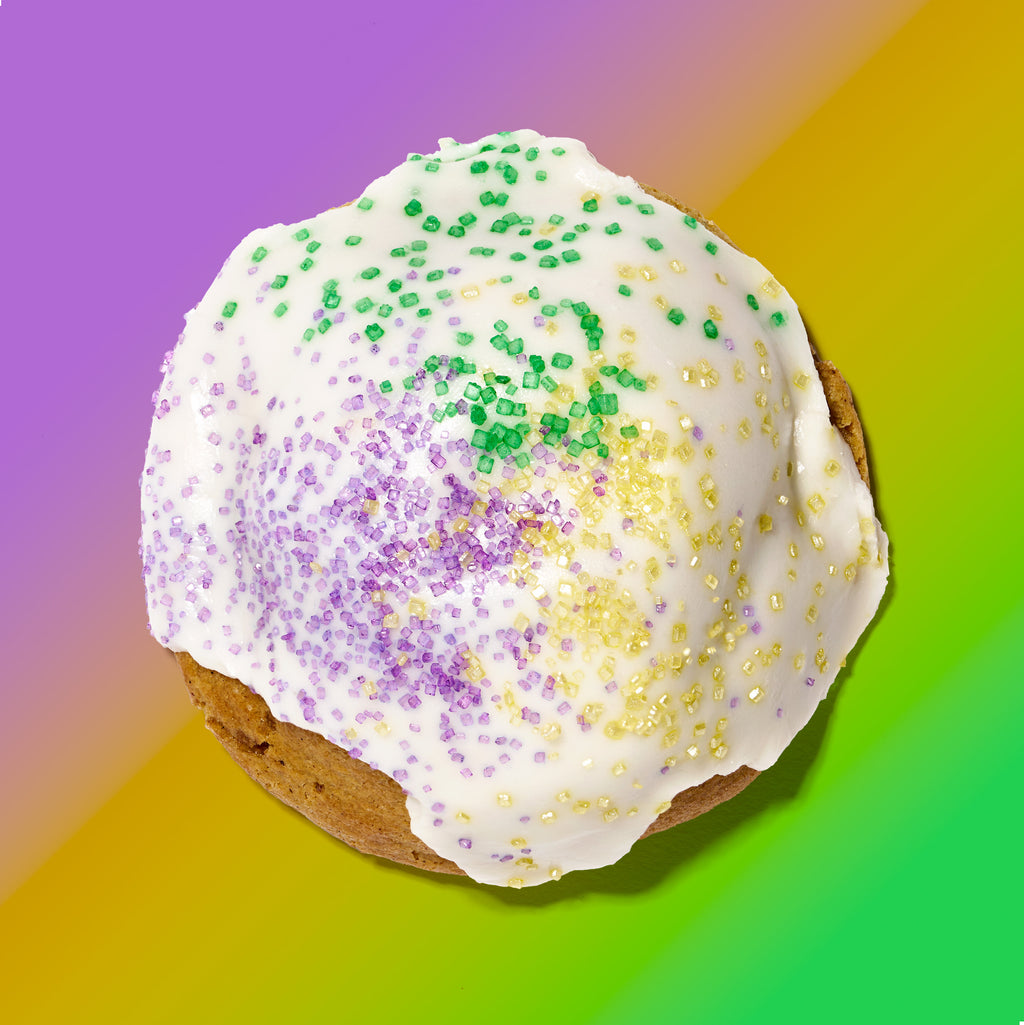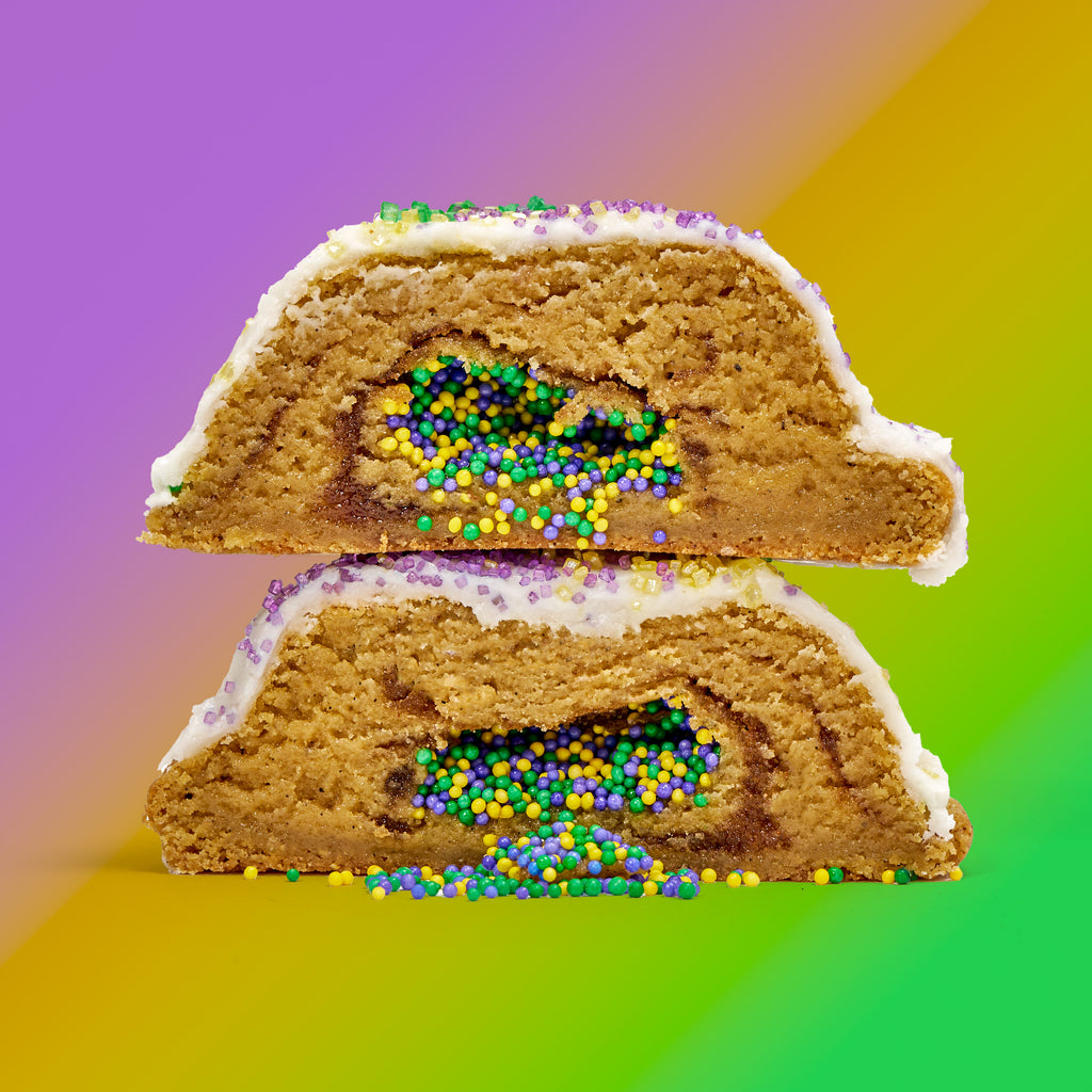 Oh, baby! Well there may not be a plastic baby hidden inside this cookie but we think the Mardi Gras sprinkles more than make up for it. If you're a fan of King Cake, or just cinnamon rolls, you'll love this cookie. We layered cinnamon sugar filling inside our cookie dough and folded it (instead of rolling) exactly like a King cake is made, and then topped it with icing with a hint of lemon and colored sugar.